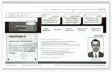 Developed an internal corporate website to provide staff with administrative information and tools. Conducted task analysis and user testing to determine site architecture and content. Worked with programmers to create tools including an online sign-in sheet. Wrote "spotlight" articles on employees and tips on work-related topics. Coordinated updates and maintenance. |