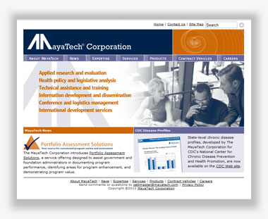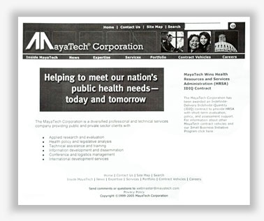 During tenure with The MayaTech Corporation, worked on several redesigns of the corporate website. Figure A is the 2006 version and Figure B is the current version, which was launched in 2009. For the 2006 version, worked with content providers, graphics designers, and programmers to develop architecture and page content. Wrote, edited, reviewed, and tested website content. Coordinated ongoing maintenance. For the 2009 version, worked with graphics designers and programmers to enhance the site's look and feel. Reviewed existing content for usability and currency. |