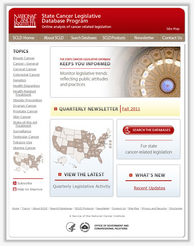 The National Cancer Institute State Cancer Legislative Database (SCLD) provides legislators and the general public with information about state laws related to cancer. Figure A is the 2006 version, and figure B is the current version. The redesign in 2009 focused on enhancing usability and updating the graphic design. Completely reorganized architecture to provide users with direct access to content based on topic. Worked with programmers to develop administrative tools for producing both web content and print documents from database. Worked with graphics designer to layout pages in modular and user-friendly fashion. |